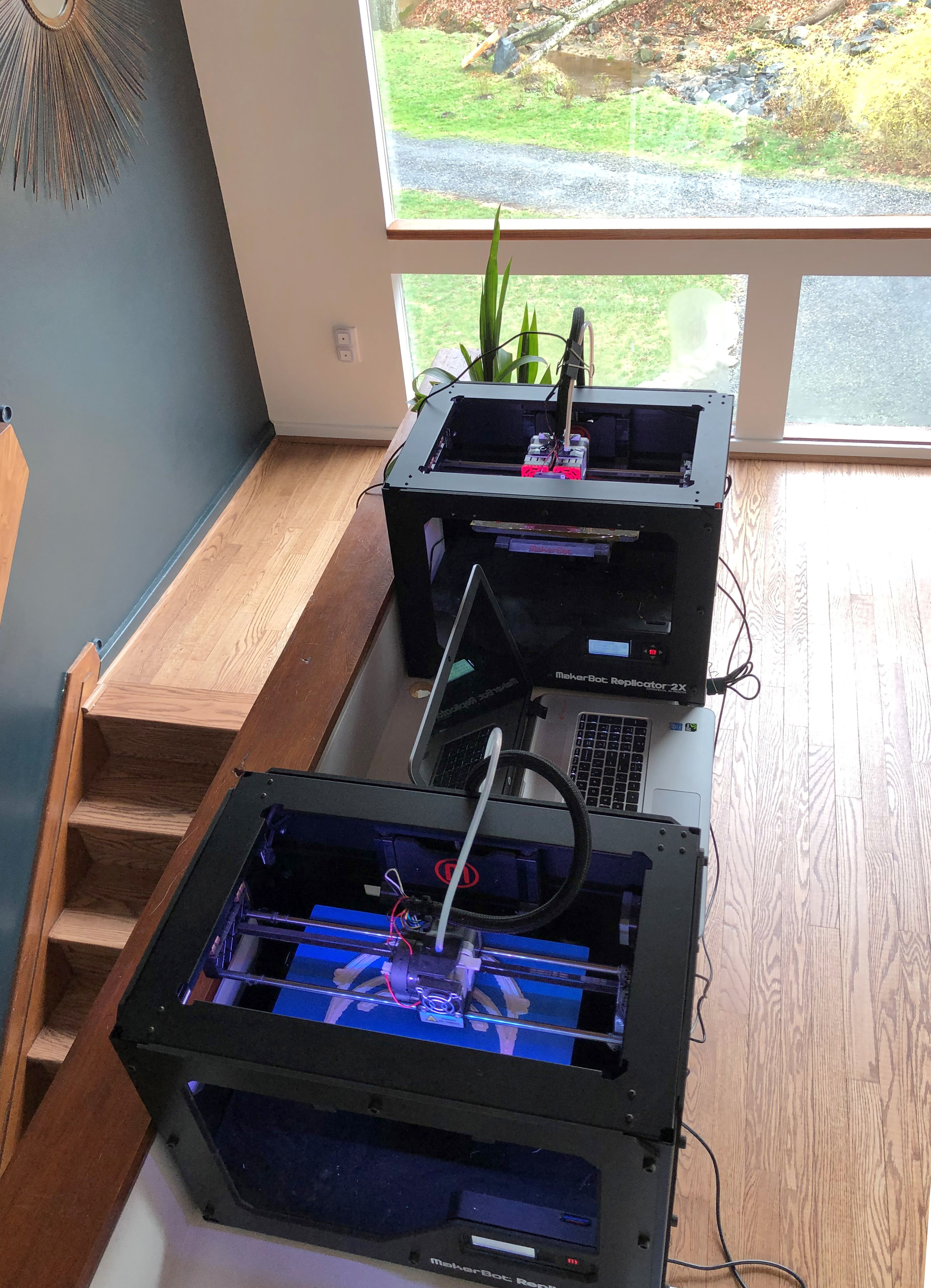 While DCI, deemed an essential business, remains open, Nick and many other employees are working remotely. Nick opted to bring the printers and materials home, just in case office doors were shut. Now, hooked up in his living room, the printers hum away in production, each piece expected to take 3 hours to produce.