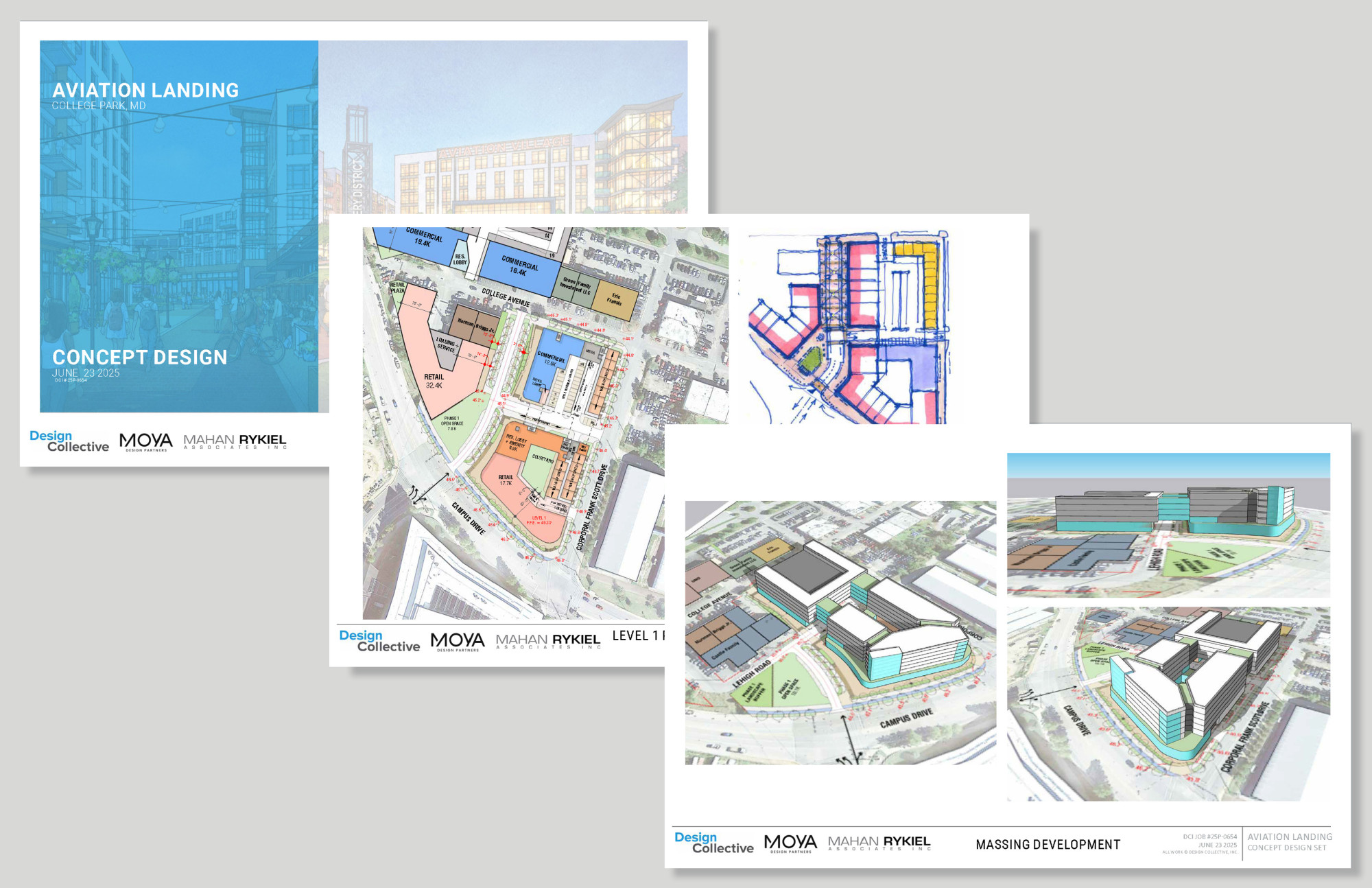 Design Collective was engaged by Terrapin Development Company (UMD’s development arm), Mosaic Development Partners (P3 partner), the University of Maryland (land owners), and the Castle Family (land owners) to prepare a master plan and feasibility study for an approximate 20-acre area adjacent to the College Park Airport, the Aviation Museum, and the College Park Metro and Light Rail Stations – properties owned jointly by UMD, the County, and the Castle Family. The master plan and feasibility study supported the P3 team’s purchase of Prince George’s County-owned land and outlined a vision for transforming the 20-acre, underutilized industrial area into a vibrant, mixed-use, TOD district with aeronautics-focused businesses, incubators, maker space, university uses, housing, restaurants, and shops. The feasibility study considered county-owned land, private land, and UMD land.