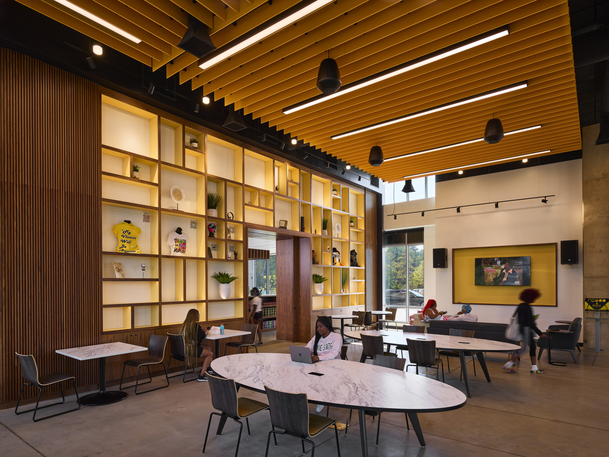 A sweeping curve of metal, glass, and light brick celebrates the Entrepreneurship Center and opens to the retail plaza and parking beyond. This glassy volume promotes transparency and vibrancy to encourage activity and collaboration between the academic, retail, and residential amenity uses. It also serves as a beacon, drawing in residents, faculty, and the greater community.