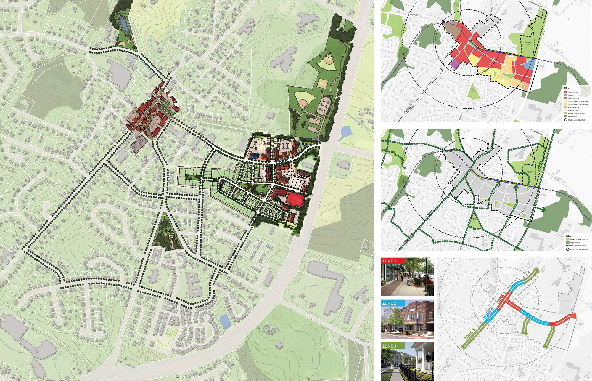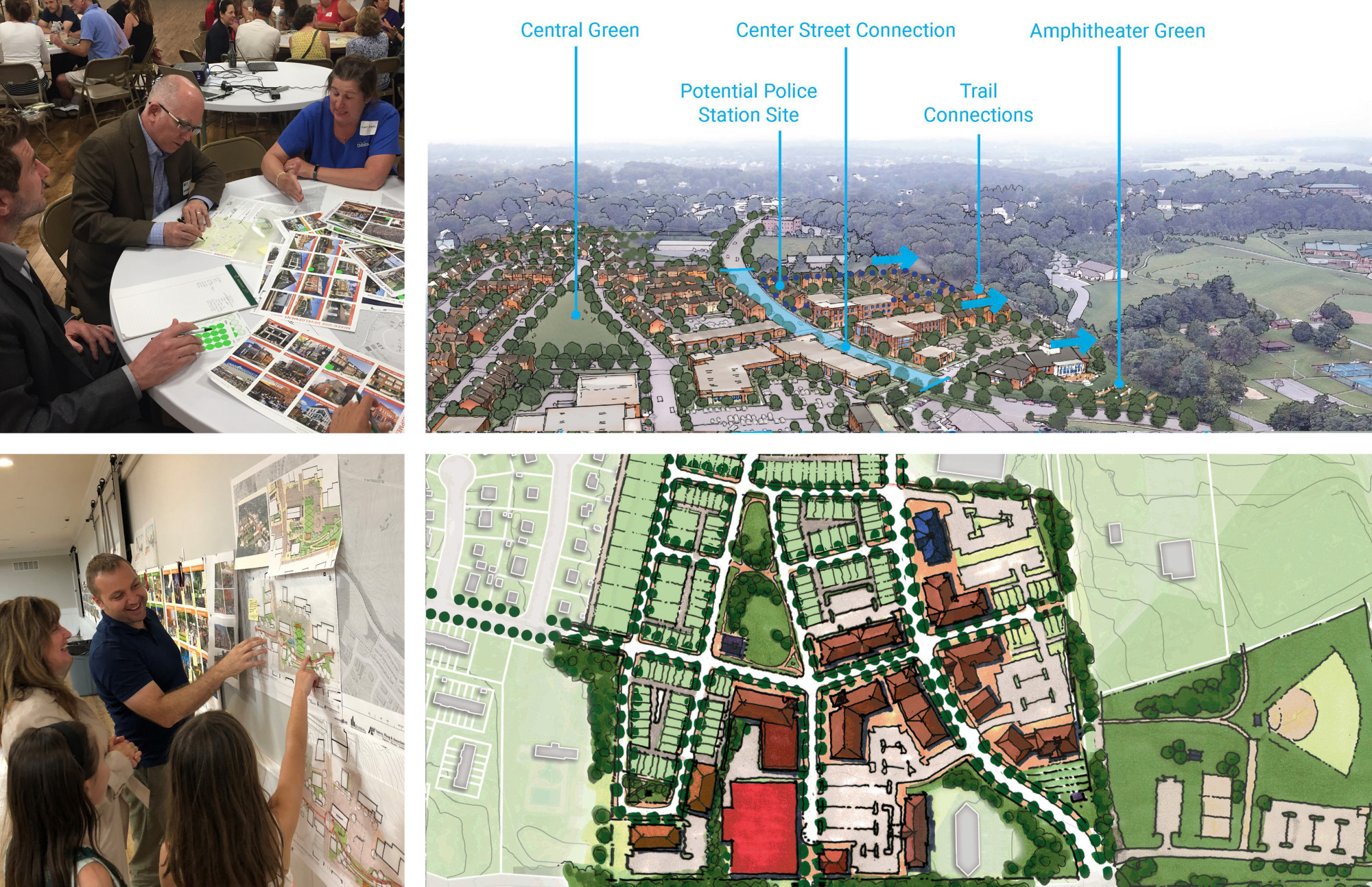 Charrette deliverables included artist renderings (before-and-after illustrations), illustrative plans, detailed streetscape and parks plans, and several diagrams that address land use, block and street patterns, connectivity, parking, circulation, pedestrian and bike trails, open space and parks, and numerous other considerations. The master plan describes land use and development guidelines, including quantification of the gross square feet of new development program, for developable properties in downtown, along the Center Street corridor, and within the study area boundaries. The final master plan includes implementation strategies, a phased streetscape plan, zoning recommendations, and infrastructure recommendations and costs, in addition to the deliverables prepared during and post charrette.