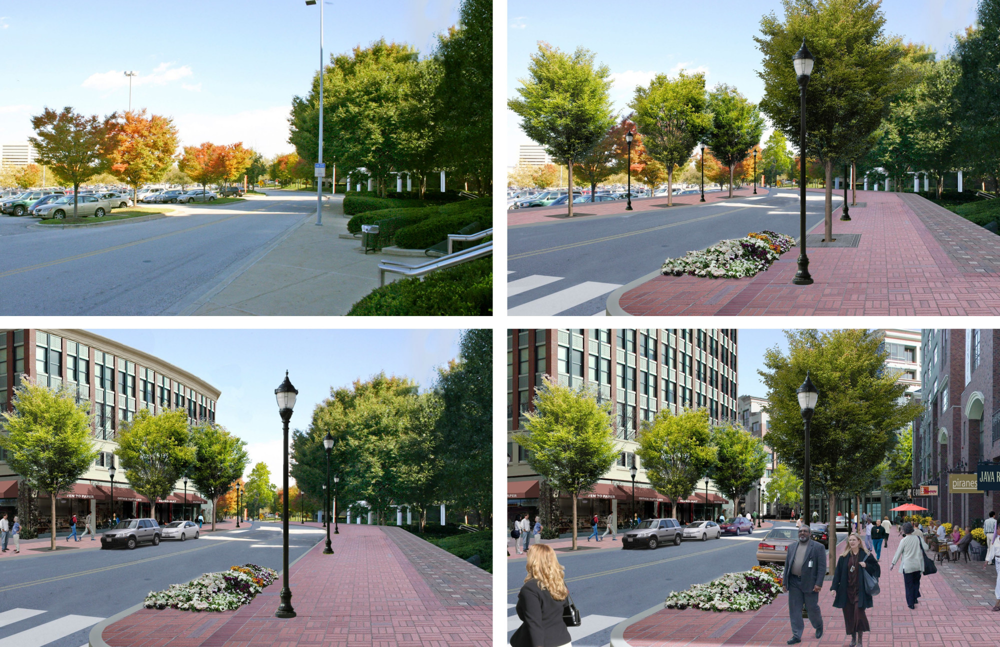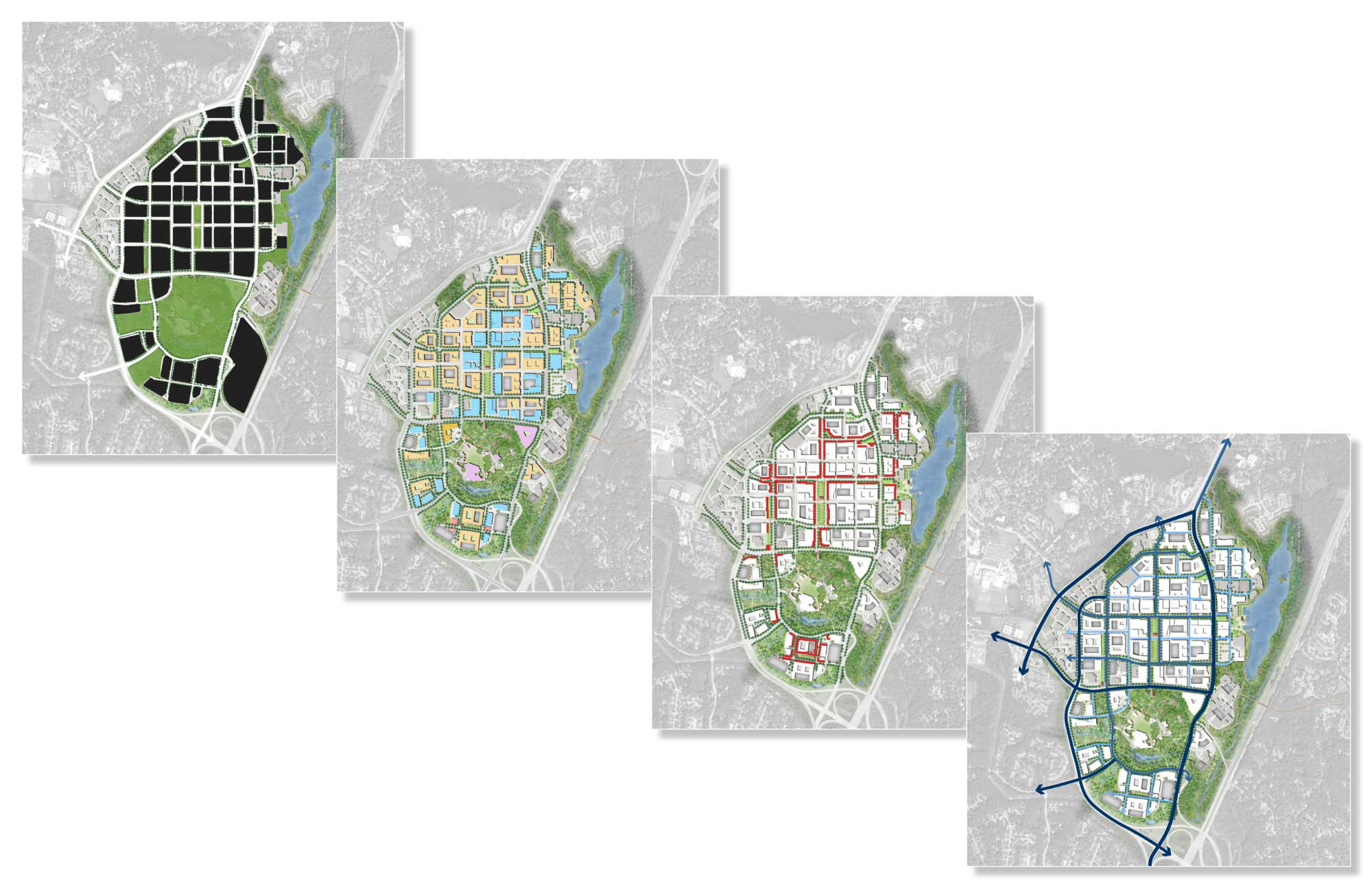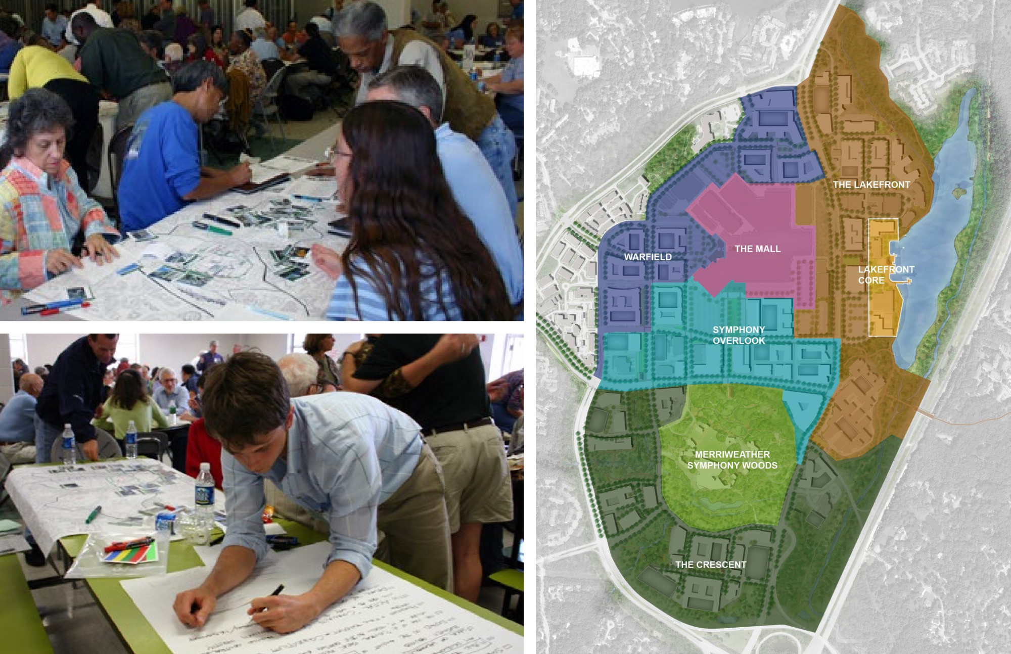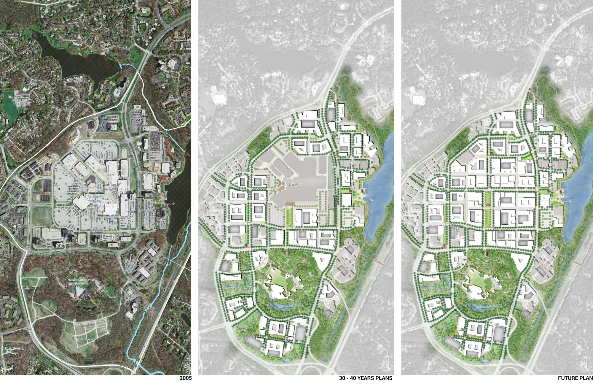 The master plan establishes four distinct neighborhoods with appropriate and varying densities, building heights, and block and street patterns, informed by the context of surrounding neighborhoods to ensure compatibility, including Warfield, Symphony Overlook, Merriweather, and Lakefront. Governor Warfield Parkway and Little Patuxent Parkway are reimagined as more walkable corridors with frequent intersections, shorter block lengths, bike lanes, and reduced travel lanes. The Plan guides redevelopment with an entirely new pattern of walkable streets and blocks; the extension of nearby neighborhood streets to better link nearby neighborhoods to the Downtown; requirements for new greens, squares, and plazas; enhanced environmental and natural areas; a percent for art program; and a phased implementation strategy that guides public and private investments. The plan, too, calls for the creation of an Affordable Housing Commission, an Arts and Cultural Commission, and a Downtown Partnership (all of which have been formulated), to ensure civic, arts, event, and cultural considerations support the Downtown vision. Design guidelines establish regulations for urban, architectural, street and streetscape, and public open space design. To date, more than $500M of combined public and private infrastructure and development investment has begun the transformation.