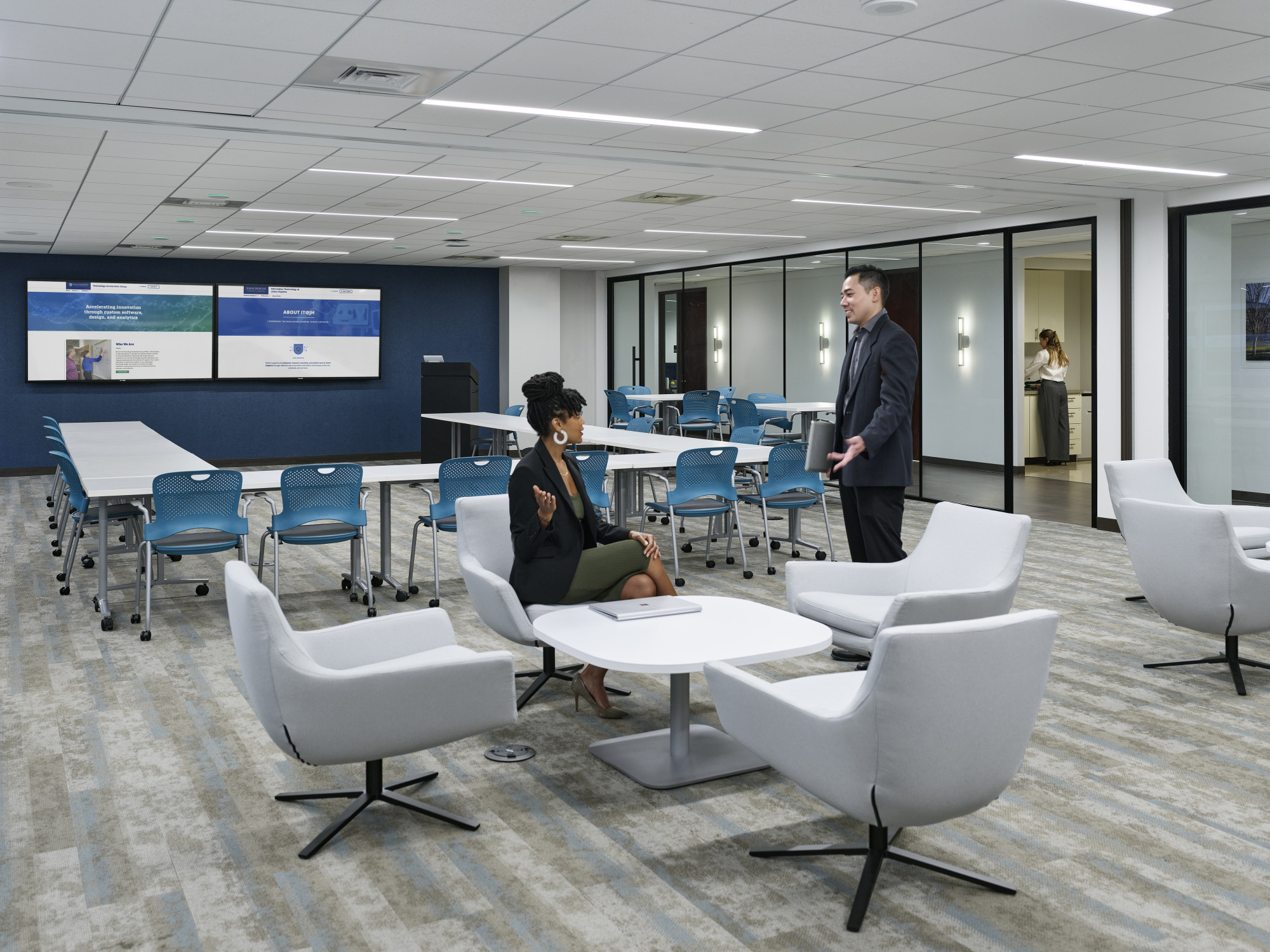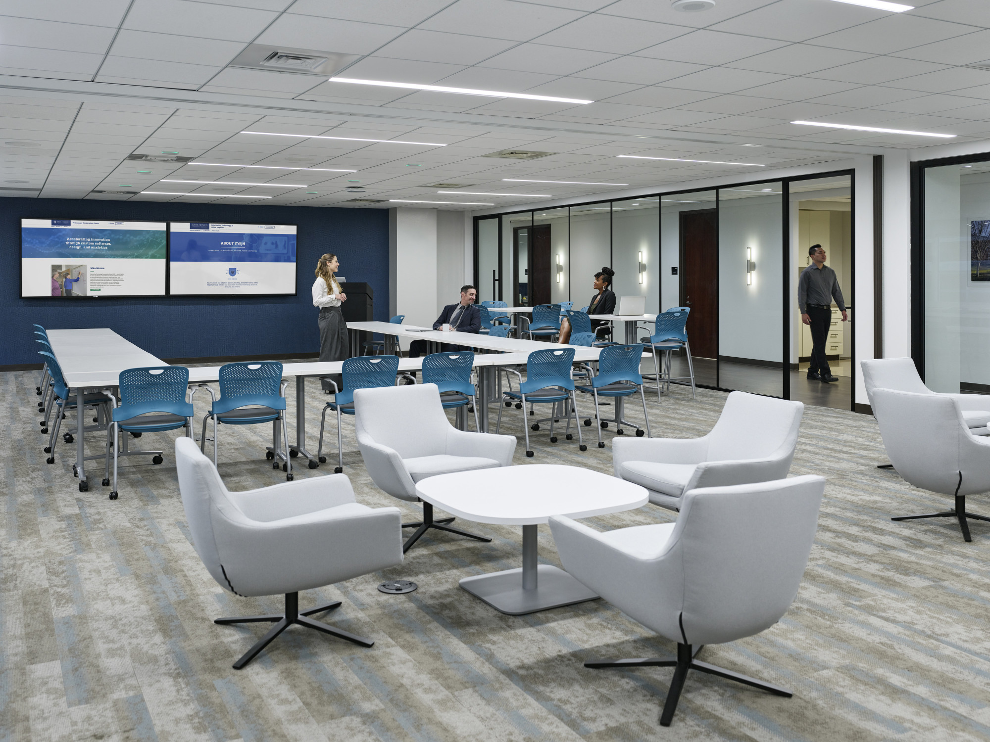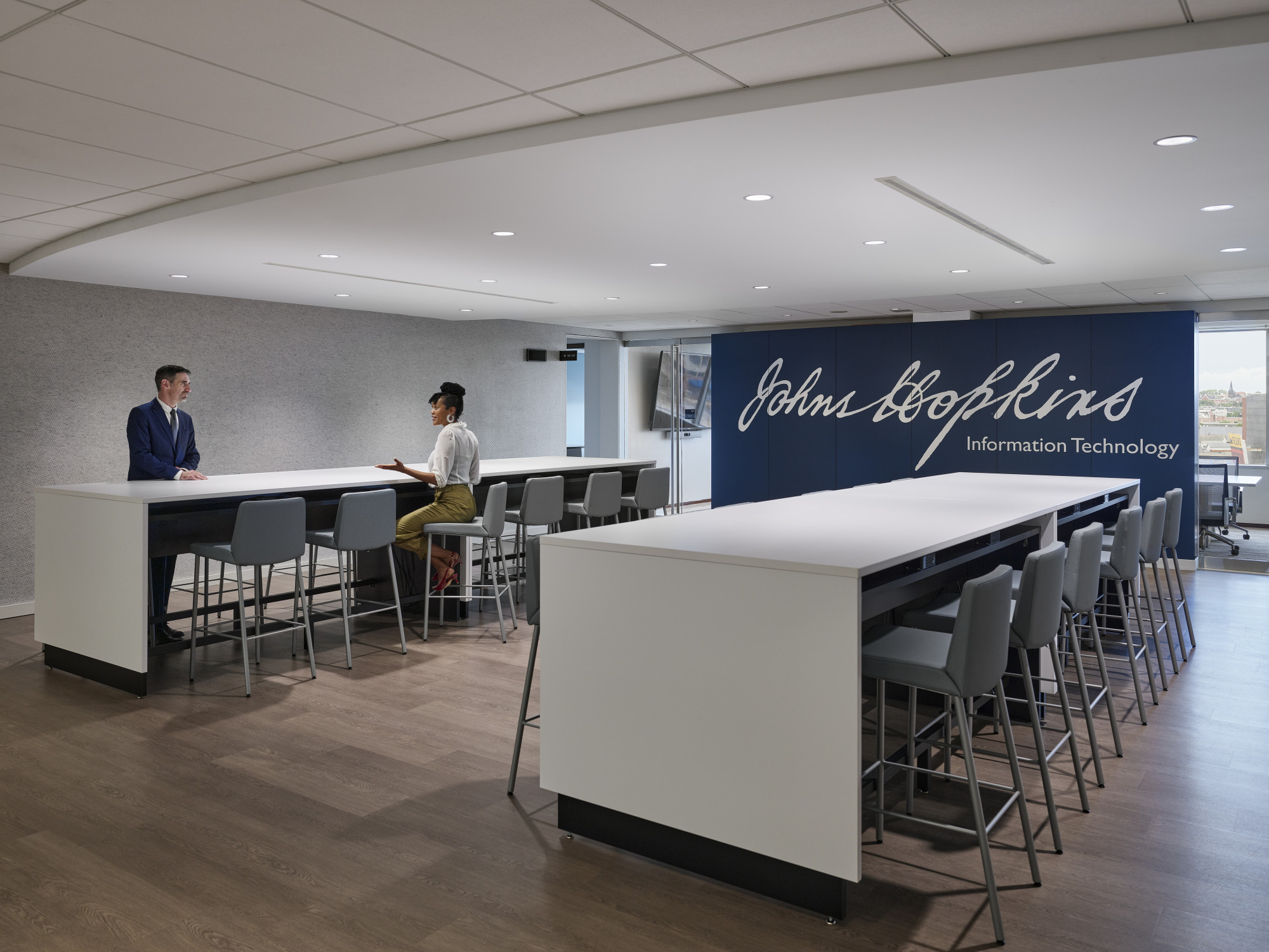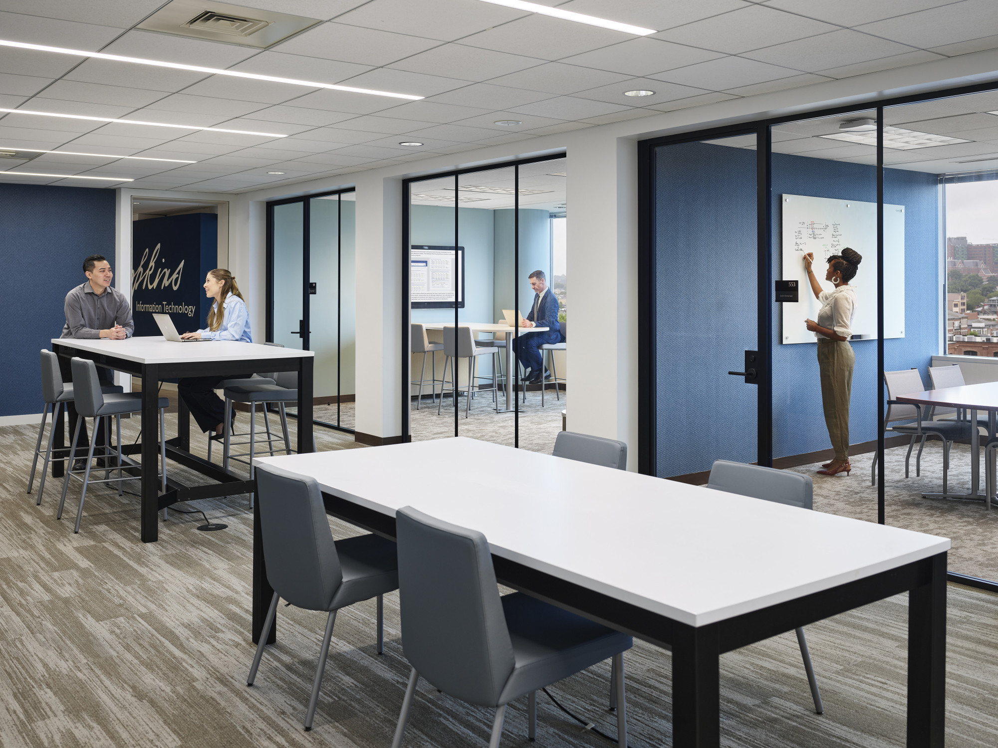 With so many of its employees working remotely, Johns Hopkins Health IT’s lease of 65,000 SF on three floors at 1000 Lancaster Street was no longer necessary. That and the expiration of their lease presented the opportunity to relocate and right-size their offices. JH Health IT and the design team had a compressed schedule of six months to consolidate the office onto 25,000 SF of one floor. The space was dated as it had not been renovated in over 20 years, had no collaborative spaces and little to no light available for the open office areas. Design Collective was engaged to design a space that would accommodate the needs of a hybrid work environment while aligning the group’s functional needs as the organization’s technology arm. The main goals of the exercise included creating a sense of arrival, opening the space, and providing access to natural light for all interior spaces. Additionally, to accommodate the 350 hybrid workers, the design team turned a lot of the existing office spaces into meeting spaces of various sizes. Besides the C-suite, all other offices on the floor remained unoccupied and connected to a flexible scheduler. The open areas once occupied by a sea of cubicles, were planned to accommodate hot-desking, and collaborative spaces for teams to gather when they are on-site. Lastly, an existing large open area adjacent to the existing pantry and open to the corridor was identified to meet the need for two large training rooms, a folding partition was included to enhance flexibility into one big space when needed.