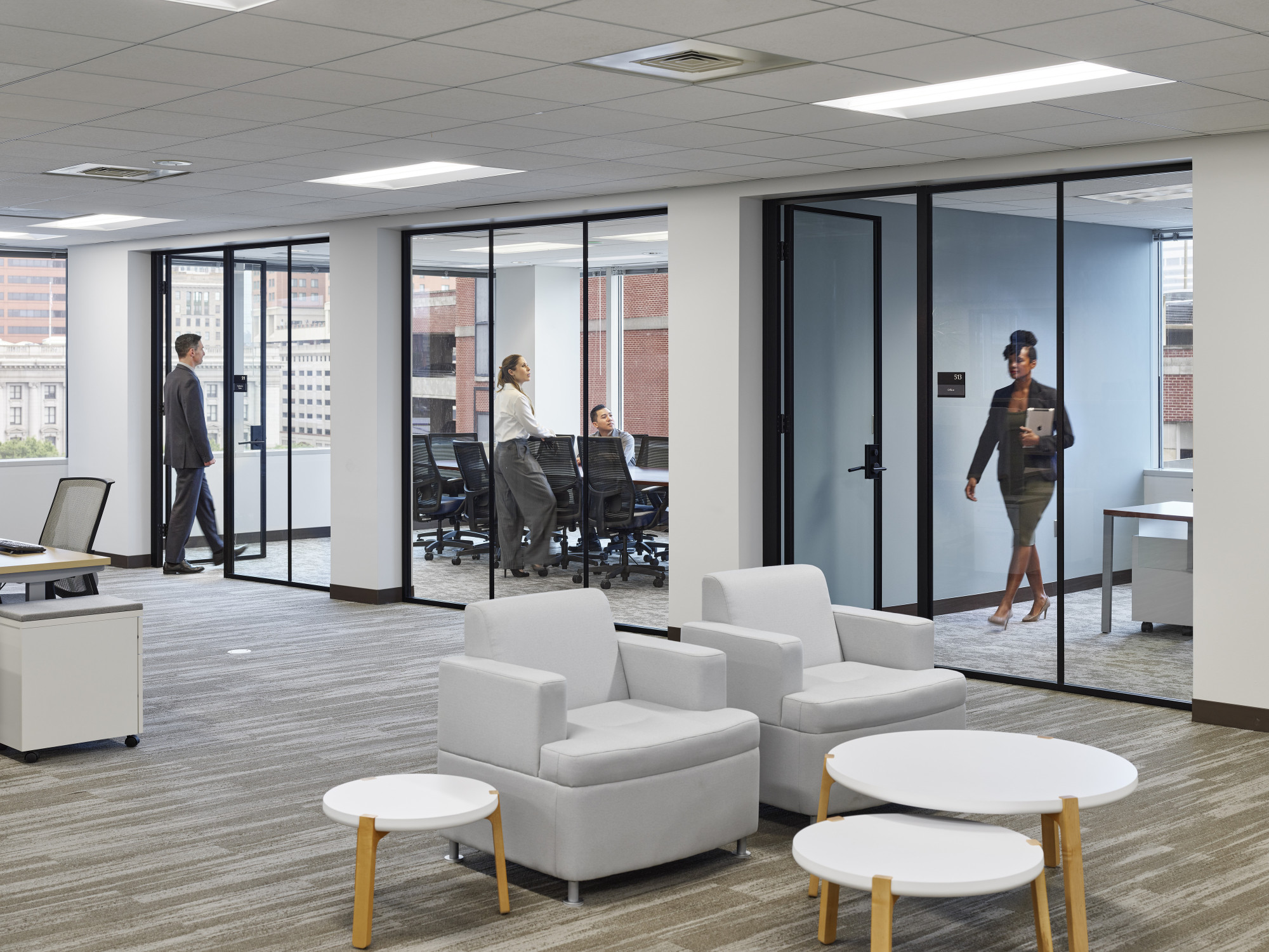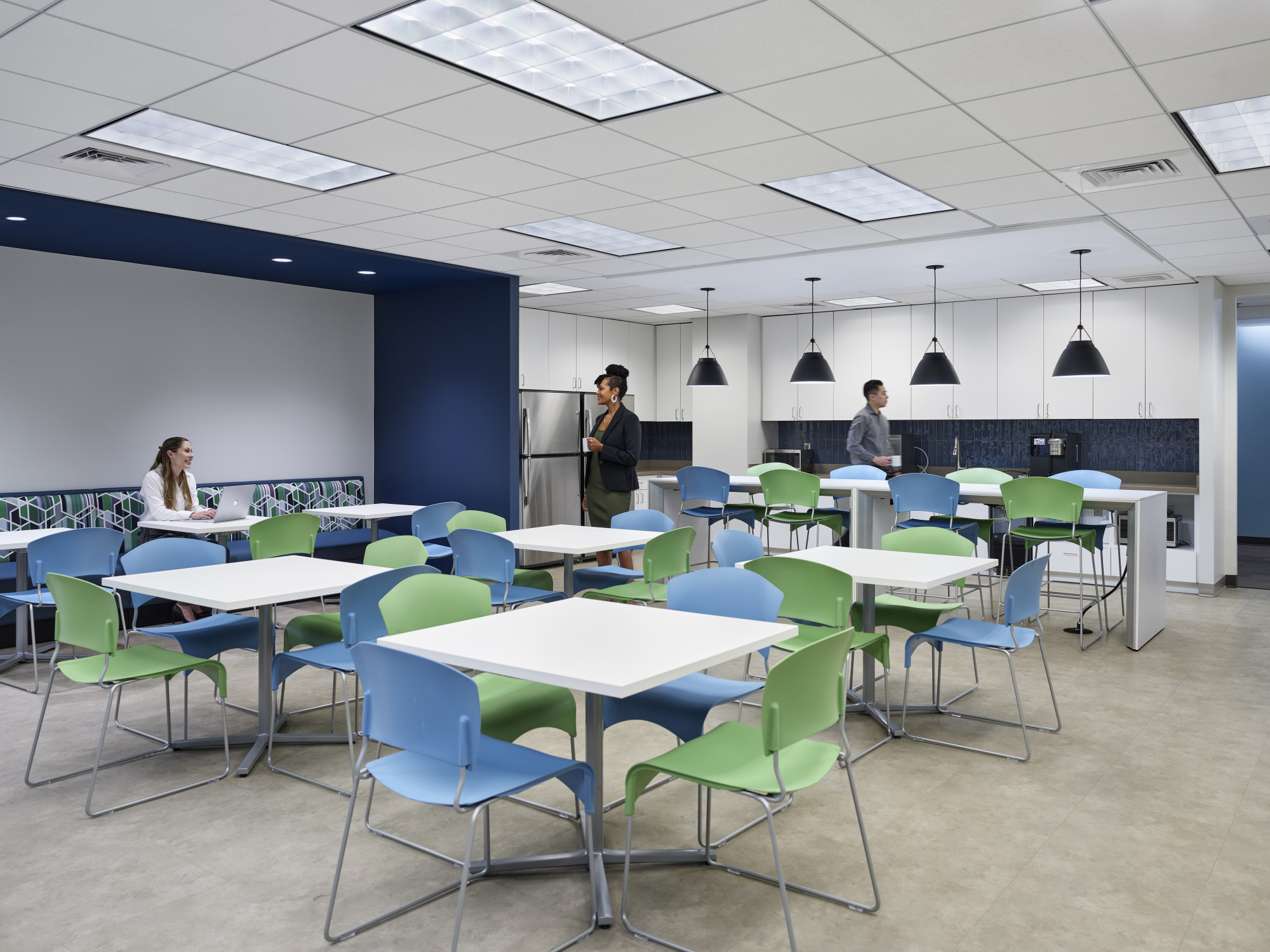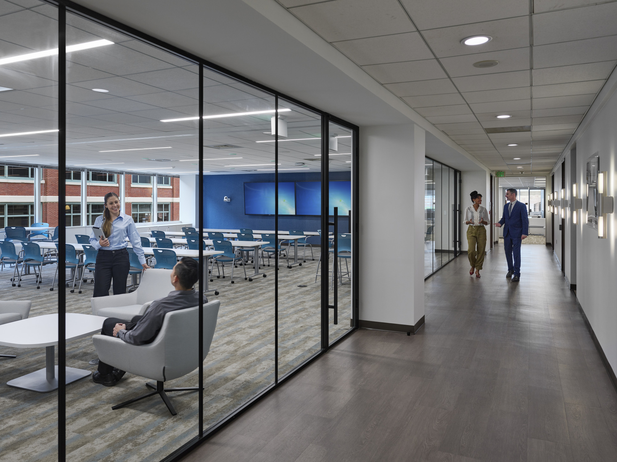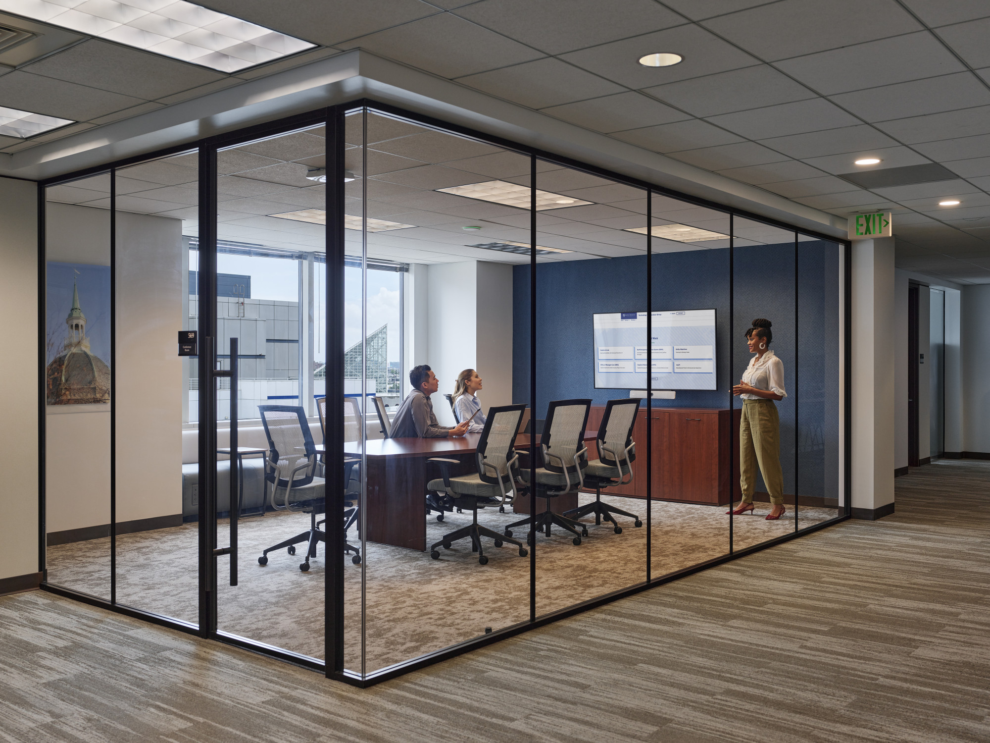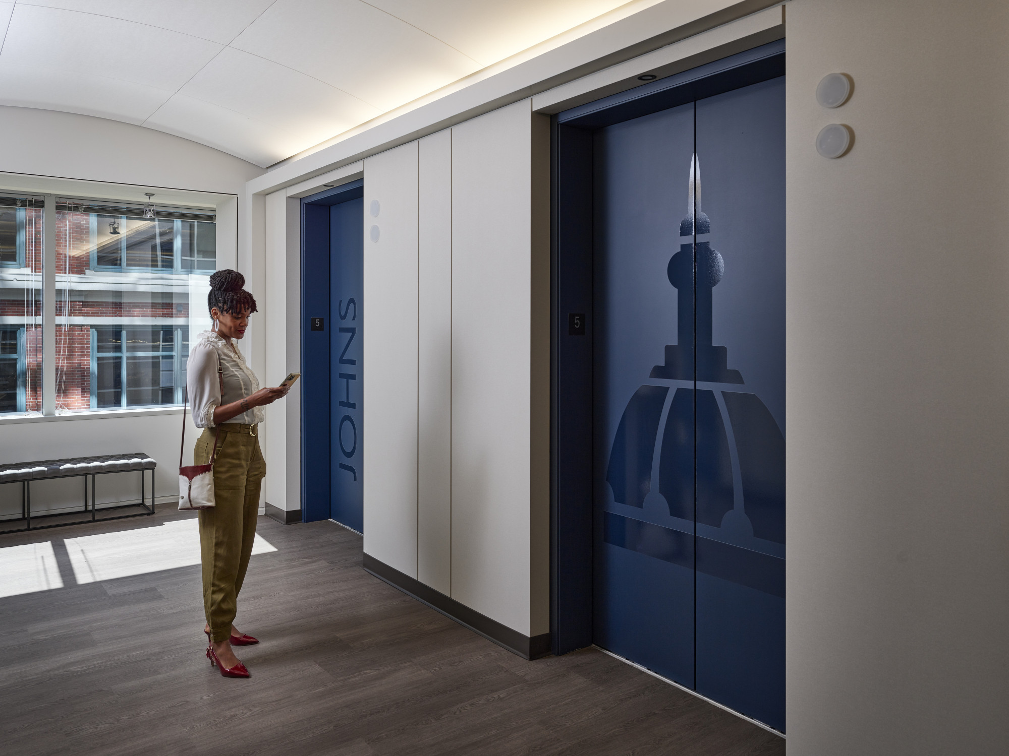 With so many of its employees working remotely, Johns Hopkins Health IT’s lease of 65,000 SF on three floors at 1000 Lancaster Street was no longer necessary. That and the expiration of their lease presented the opportunity to relocate and right-size their offices. JH Health IT and the design team had a compressed schedule of six months to consolidate the office onto 25,000 SF of one floor. The space was dated as it had not been renovated in over 20 years, had no collaborative spaces and little to no light available for the open office areas. Design Collective was engaged to design a space that would accommodate the needs of a hybrid work environment while aligning the group’s functional needs as the organization’s technology arm. The main goals of the exercise included creating a sense of arrival, opening the space, and providing access to natural light for all interior spaces. Additionally, to accommodate the 350 hybrid workers, the design team turned a lot of the existing office spaces into meeting spaces of various sizes. Besides the C-suite, all other offices on the floor remained unoccupied and connected to a flexible scheduler. The open areas once occupied by a sea of cubicles, were planned to accommodate hot-desking, and collaborative spaces for teams to gather when they are on-site. Lastly, an existing large open area adjacent to the existing pantry and open to the corridor was identified to meet the need for two large training rooms, a folding partition was included to enhance flexibility into one big space when needed.