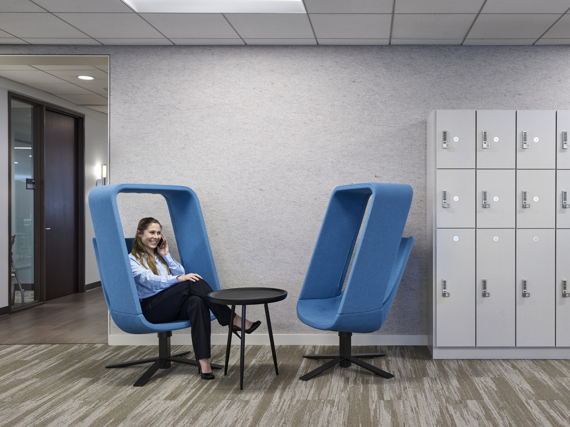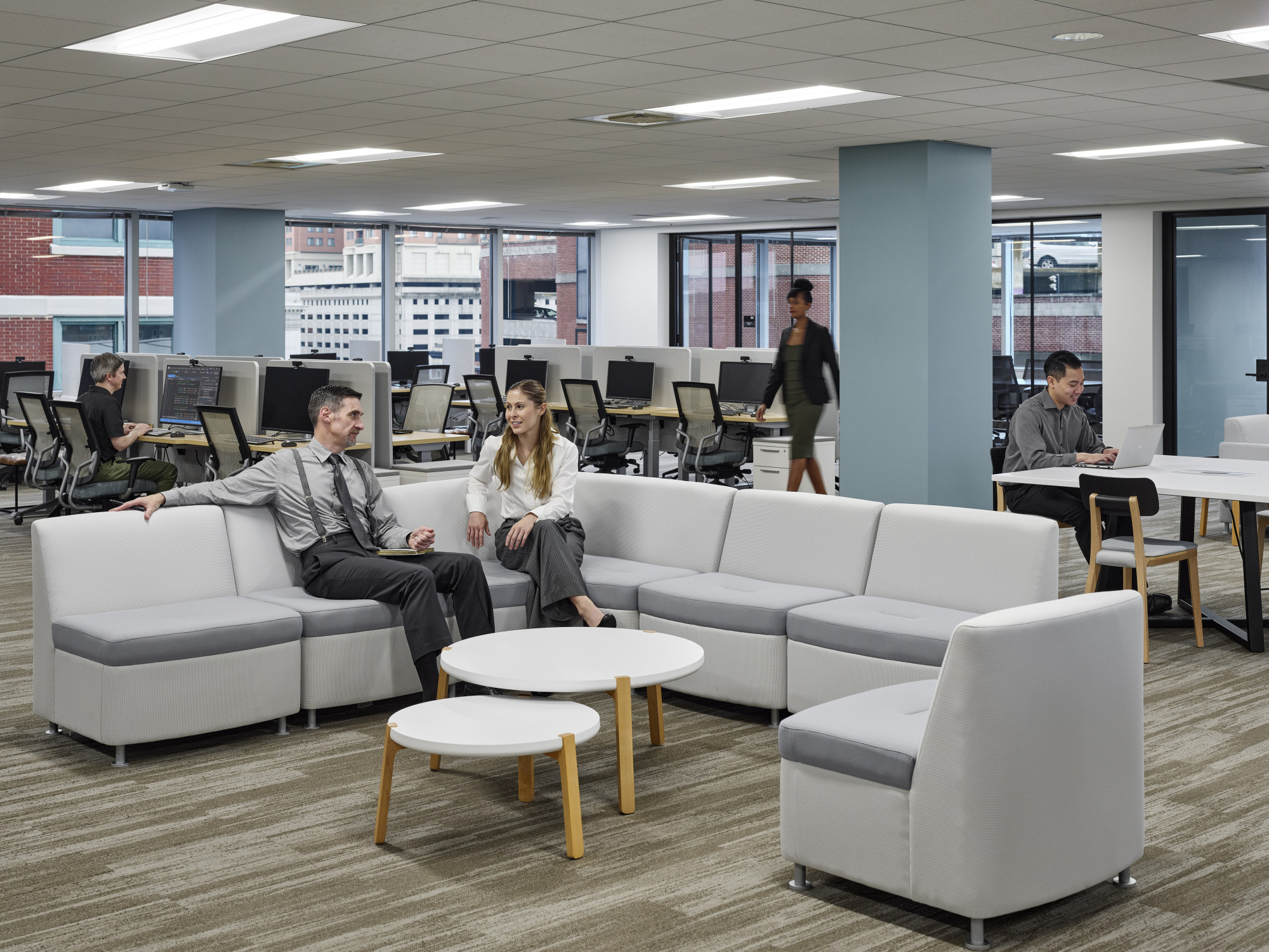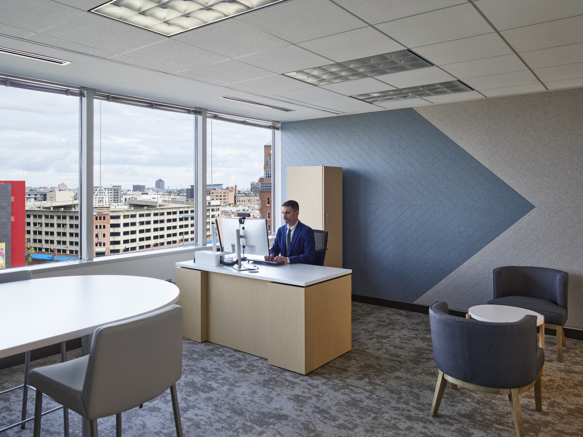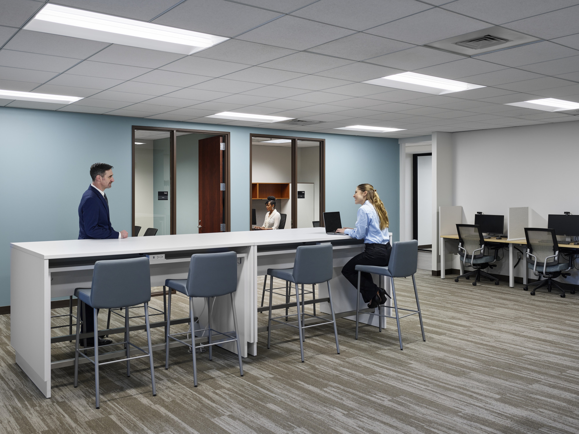 With so many of its employees working remotely, Johns Hopkins Health IT’s lease of 65,000 SF on three floors at 1000 Lancaster Street was no longer necessary. That and the expiration of their lease presented the opportunity to relocate and right-size their offices. JH Health IT and the design team had a compressed schedule of six months to consolidate the office onto 25,000 SF of one floor. The space was dated as it had not been renovated in over 20 years, had no collaborative spaces and little to no light available for the open office areas. Design Collective was engaged to design a space that would accommodate the needs of a hybrid work environment while aligning the group’s functional needs as the organization’s technology arm. The main goals of the exercise included creating a sense of arrival, opening the space, and providing access to natural light for all interior spaces. Additionally, to accommodate the 350 hybrid workers, the design team turned a lot of the existing office spaces into meeting spaces of various sizes. Besides the C-suite, all other offices on the floor remained unoccupied and connected to a flexible scheduler. The open areas once occupied by a sea of cubicles, were planned to accommodate hot-desking, and collaborative spaces for teams to gather when they are on-site. Lastly, an existing large open area adjacent to the existing pantry and open to the corridor was identified to meet the need for two large training rooms, a folding partition was included to enhance flexibility into one big space when needed.