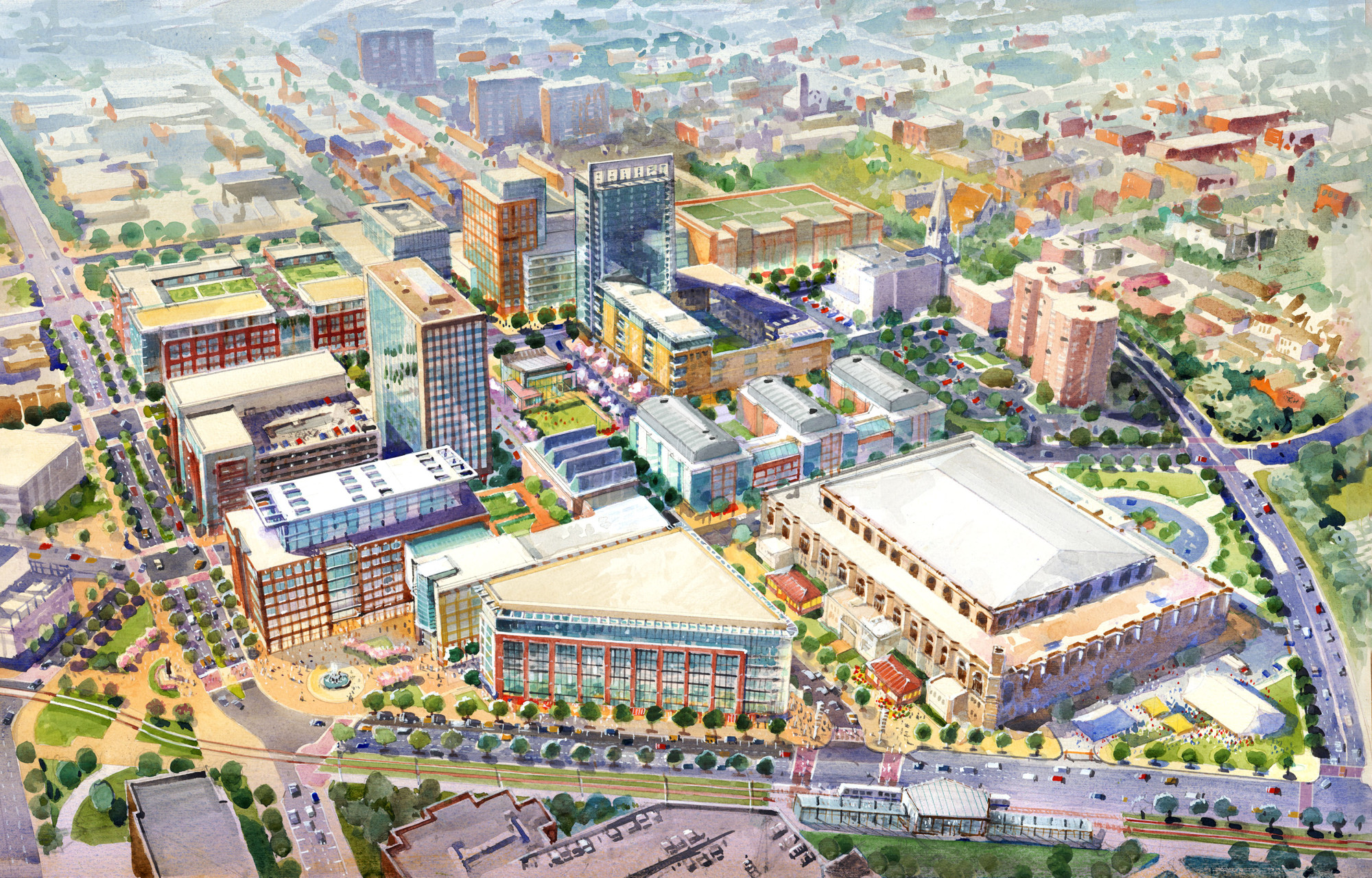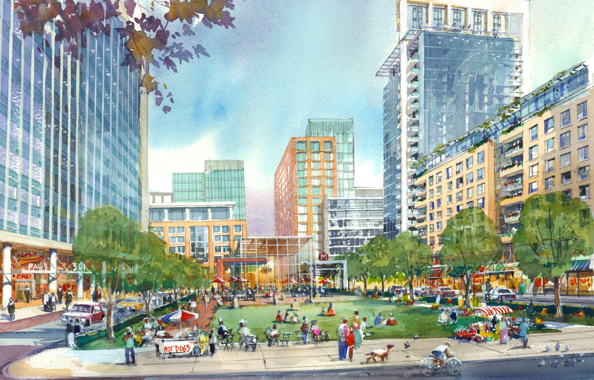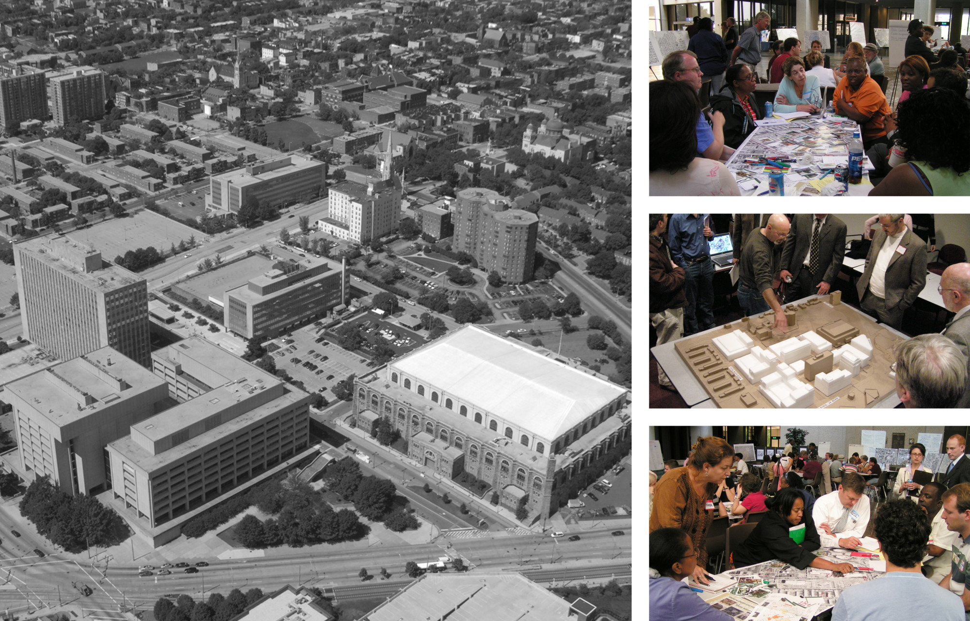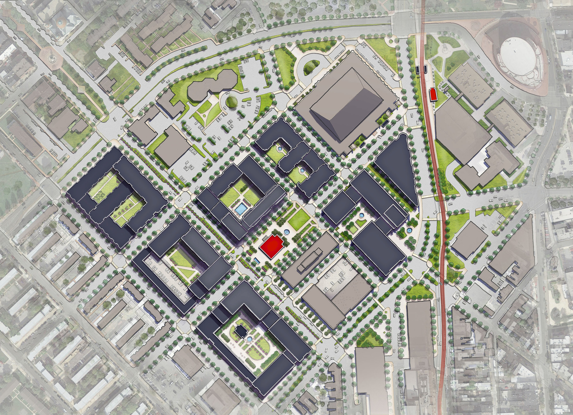 State Center is an obsolete, 28-acre government office complex developed in the 1960's as part of an urban renewal plan that includes a Metro Station, a Light Rail Station, a Central Utility Plant, and 1.5M SF of aging state office buildings. The CNU-award winning master plan recommends complete transformation into a vibrant, mixed-use, higher density district that includes demolition, new construction and adaptive reuse, smaller pedestrian-scaled blocks, a central square, and a retail core that links the two transit stations. The master plan and accompanying Design Guidelines, including a Community Benefits Agreement (Implementation Plan), calls for 6.5M square feet of mixed use. The plan received unanimous city, Planning Commission, UDARP, and community approval as a result of an intense, community-driven public planning process. The master plan's Sustainability Action Plan calls for LEED Silver buildings, high performance building systems, a district-wide green infrastructure plan, and "green & healthy" guidelines for future residents and commercial and retail tenants.