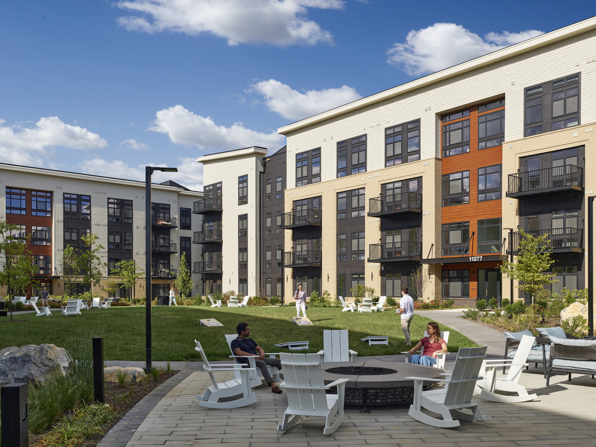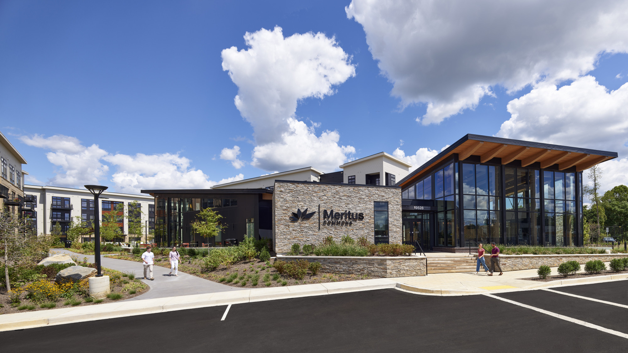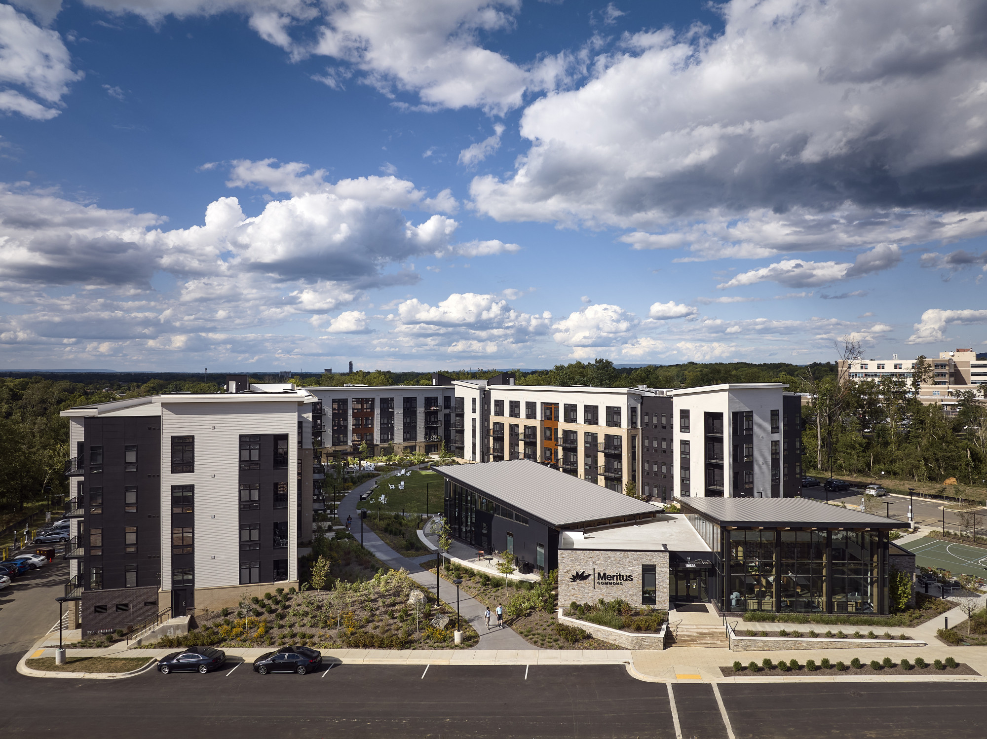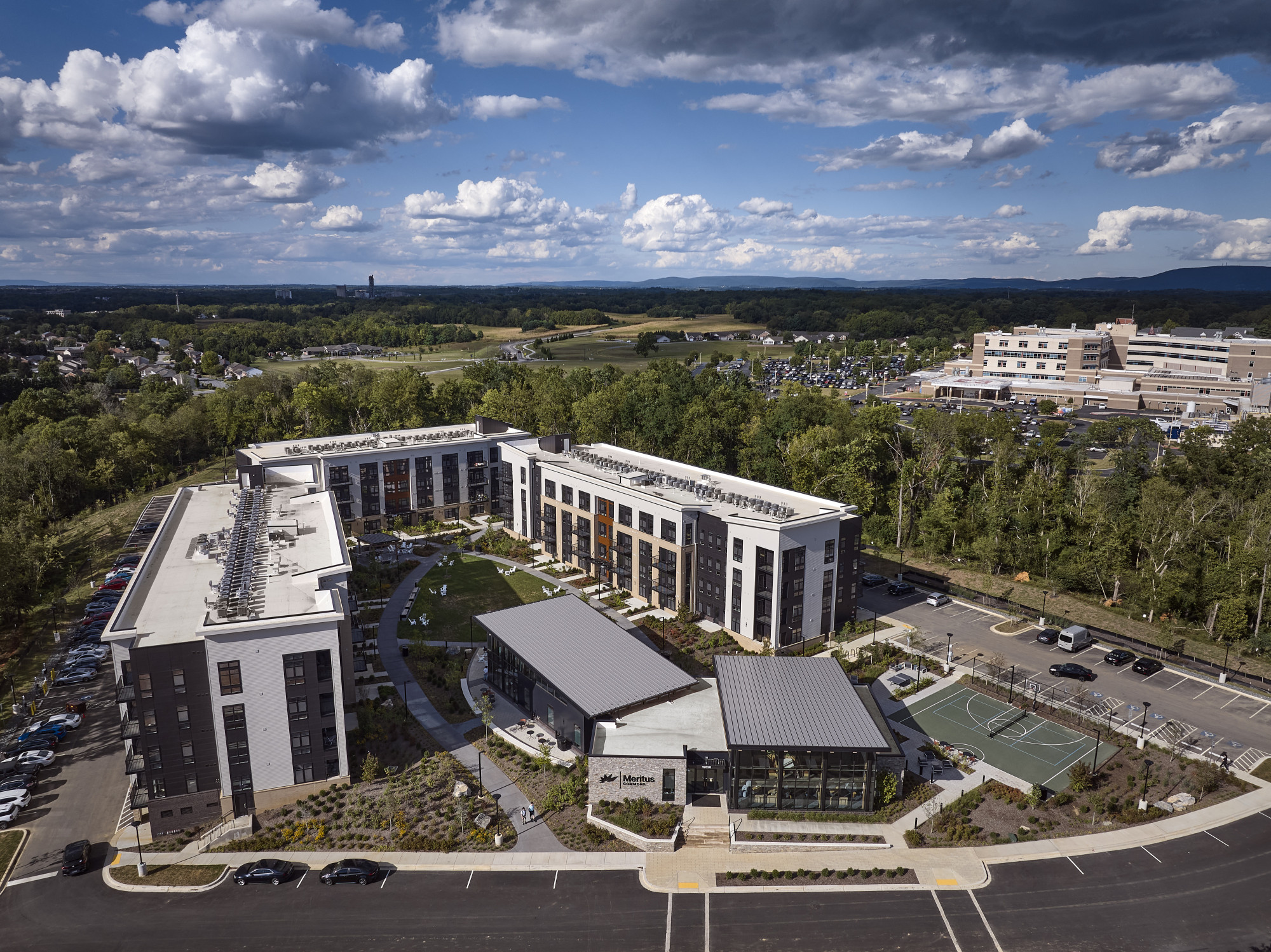 Meritus Health, Western Maryland’s largest health care provider, is looking to develop student housing accommodations to support their proposed Meritus School of Osteopathic Medicine (MSOM). 342 apartments distributed amongst five residential buildings and a common amenity building will sit on a heavily sloped, 28.5-acre site. These 4-storied residential buildings and the 1-story amenity building are organized around a central green space, to take advantage of existing site grade while respecting existing forest easements. Programmable outdoor spaces including a multi-use recreational space and dedicated bike path connecting the residences to MSOM campus promote an active lifestyle and wellness amongst residents. Energy efficient envelope design, access to daylight and views, integrating stormwater strategies into site design and biophilic design are all considerations.
